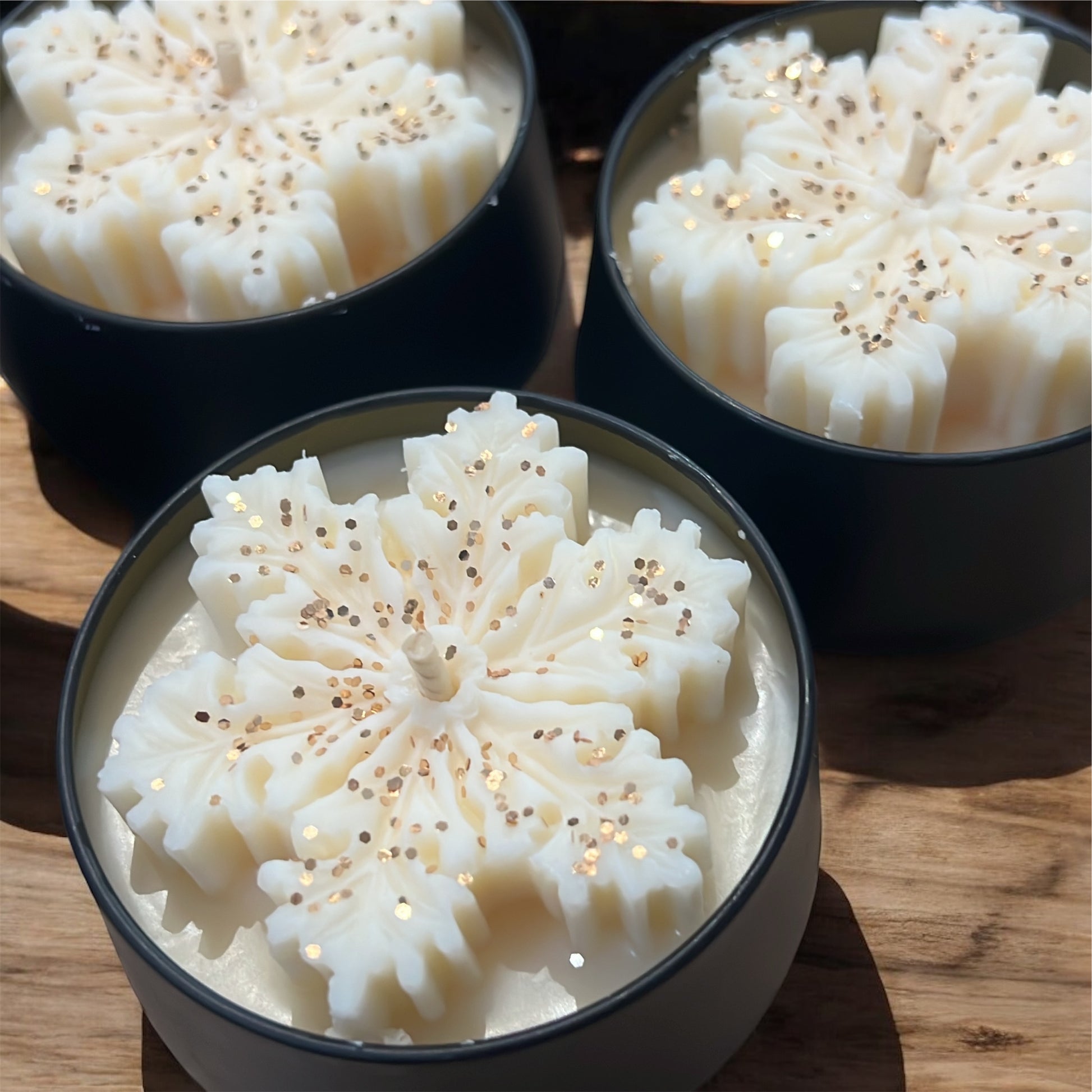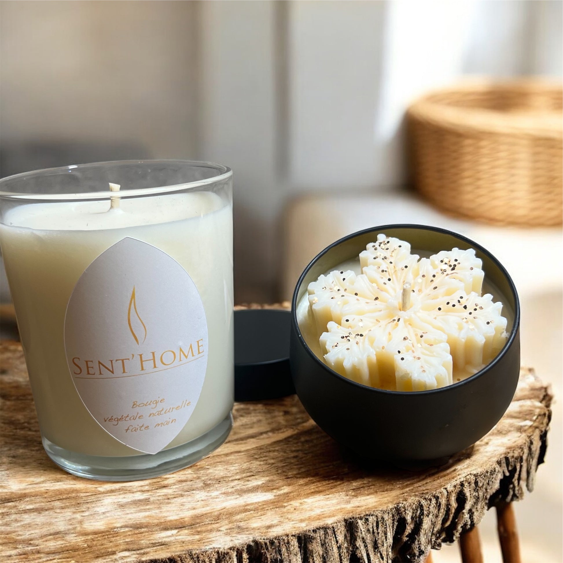 Décorée d’un flocon délicatement sculpté sur le dessus et de paillettes végétales qui captent la lumière, chaque bougie est unique.